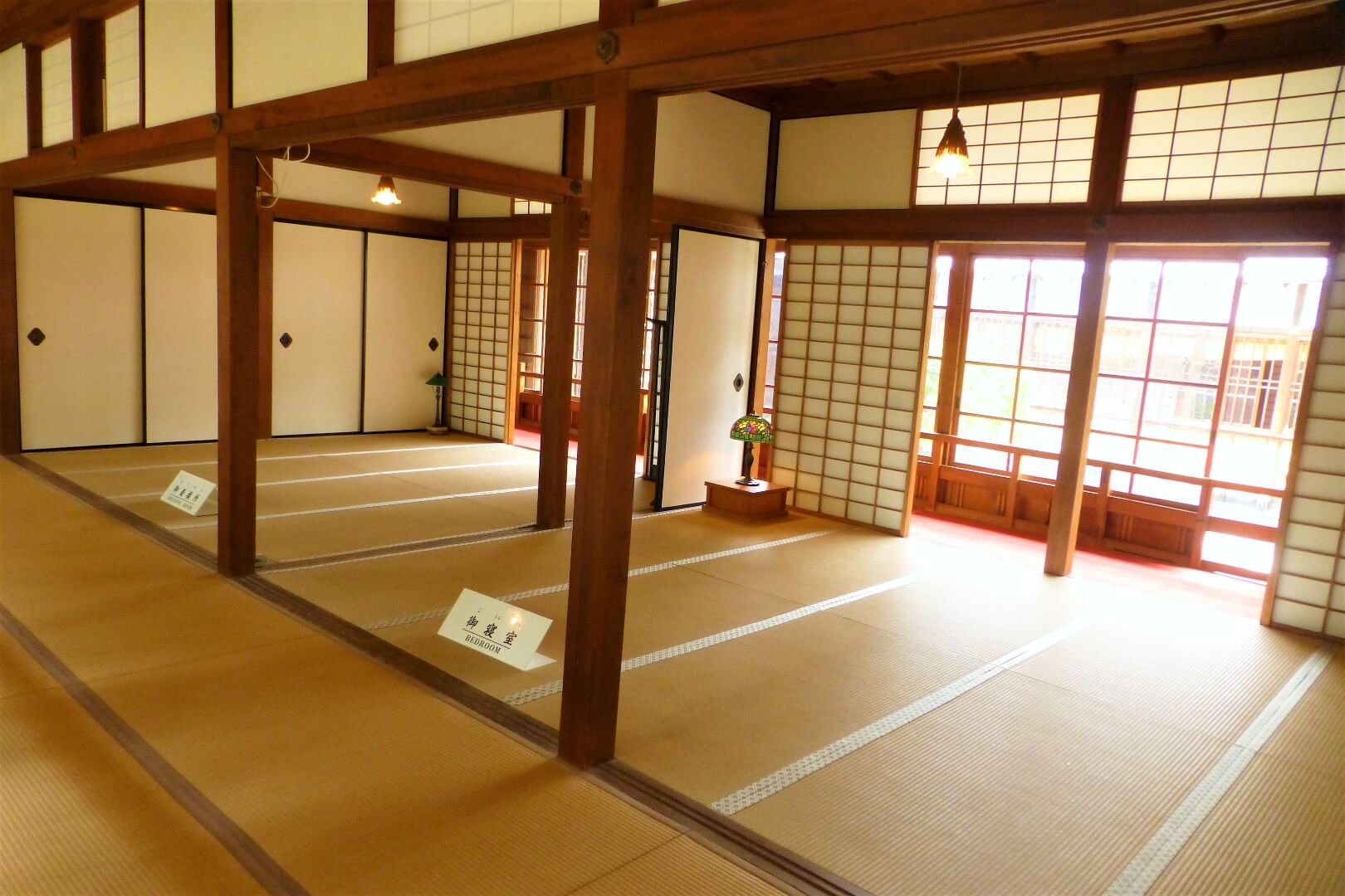 和風の建物ですが、照明は洋風デザイン。 ここで靴をポリ袋に入れ、持ち歩きながら見学します。 |